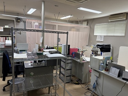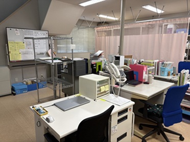 事業所内のご案内 室内は広々としています。各自ノートパソコンを持ちながらもデスクトップパソコンを2台設置しています。 玄関の近くに接客用のテーブルがあり,機密を要しない範囲でのサービス事業者との会議やご家族等への説明スペースとして使用しています。 相談室は建物の奥にあります。ご相談などへ配慮し、分厚いカーテンで閉じられる作りになっています。 介護に関するご相談は直接お越しいただけるか、お電話下されば対応いたします。 法人内の事業所紹介