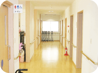 施設入口からメインフロアに繋がる廊下です。通りやすいように幅を広くとっています。スペースを利用して歩きのリハビリなども行っています。