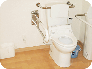 ウォシュレット対応。手すり設置。車いすの方でもご利用しやすいよう、広めのスペースを取っています。
